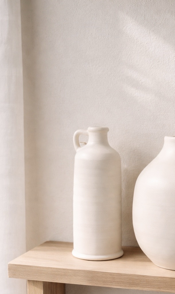 Nuestra botella con asa pequeña (21cm altura) con acabado blanco perla.