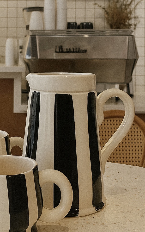 Jarra hecha a mano decorada a rayas negras.